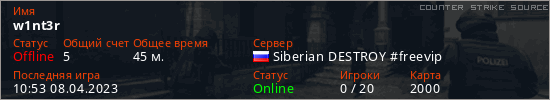 Играет на Counter Strike Source сервере. Страна: РоссияПервый раз замечен 17:02 02.04.2023