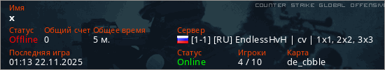 Играет на Counter Strike Global Offensive сервере. Страна: РоссияПервый раз замечен 01:09 22.11.2025