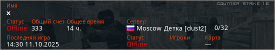 Играет на Counter Strike 1.6 сервере. Страна: РоссияПервый раз замечен 20:23 12.10.2021