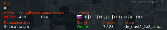 Играет на Counter Strike 1.6 сервере. Страна: РоссияПервый раз замечен 12:03 19.02.2019