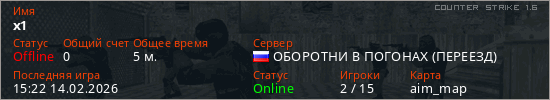 Играет на Counter Strike 1.6 сервере. Страна: РоссияПервый раз замечен 15:03 14.02.2026