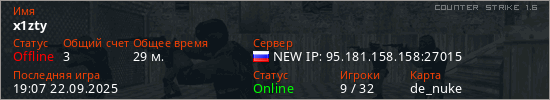 Играет на Counter Strike 1.6 сервере. Страна: РоссияПервый раз замечен 20:21 21.09.2025