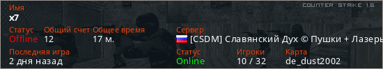 Играет на Counter Strike 1.6 сервере. Страна: РоссияПервый раз замечен 10:32 28.06.2024