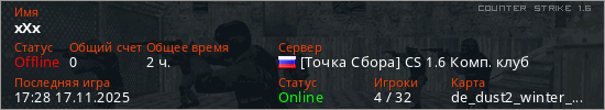 Играет на Counter Strike 1.6 сервере. Страна: РоссияПервый раз замечен 18:09 12.10.2025