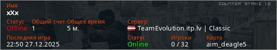 Играет на Counter Strike 1.6 сервере. Страна: ЛатвияПервый раз замечен 22:44 27.12.2025