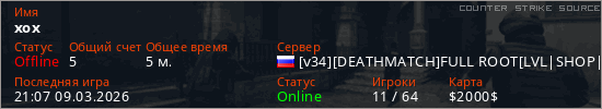 Играет на Counter Strike Source сервере. Страна: РоссияПервый раз замечен 20:30 09.03.2026