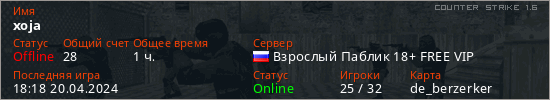 Играет на Counter Strike 1.6 сервере. Страна: РоссияПервый раз замечен 23:45 02.02.2023