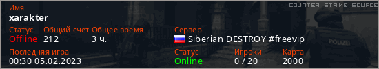 Играет на Counter Strike Source сервере. Страна: РоссияПервый раз замечен 18:05 27.01.2023