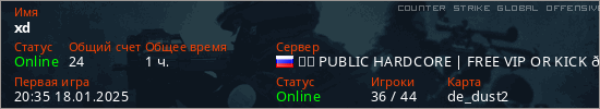 Играет на Counter Strike Global Offensive сервере. Страна: РоссияПервый раз замечен 20:35 18.01.2025