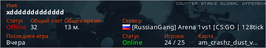Играет на Counter Strike Global Offensive сервере. Страна: РоссияПервый раз замечен 17:43 13.01.2026