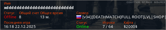 Играет на Counter Strike Source сервере. Страна: РоссияПервый раз замечен 07:57 14.08.2025