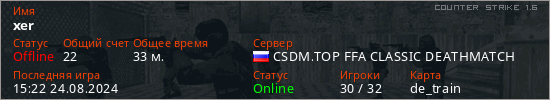 Играет на Counter Strike 1.6 сервере. Страна: РоссияПервый раз замечен 20:24 23.08.2024