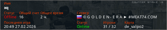 Играет на Counter Strike 1.6 сервере. Страна: РоссияПервый раз замечен 12:24 09.02.2026