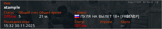 Играет на Counter Strike 1.6 сервере. Страна: РоссияПервый раз замечен 22:36 05.07.2025