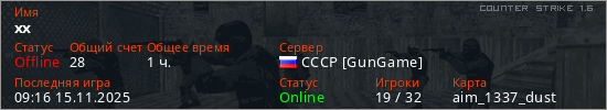 Играет на Counter Strike 1.6 сервере. Страна: РоссияПервый раз замечен 22:13 27.10.2023