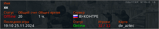 Играет на Counter Strike 1.6 сервере. Страна: РоссияПервый раз замечен 12:20 13.04.2021
