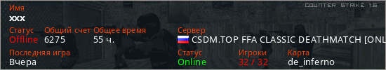 Играет на Counter Strike 1.6 сервере. Страна: РоссияПервый раз замечен 19:02 07.10.2021