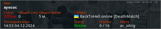 Играет на Counter Strike 1.6 сервере. Страна: УкраинаПервый раз замечен 13:53 04.12.2024