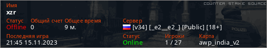 Играет на Counter Strike Source сервере. Страна: РоссияПервый раз замечен 01:13 15.11.2023