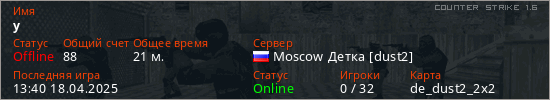Играет на Counter Strike 1.6 сервере. Страна: РоссияПервый раз замечен 20:16 02.09.2024