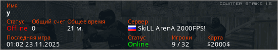 Играет на Counter Strike 1.6 сервере. Страна: РоссияПервый раз замечен 13:31 15.08.2024