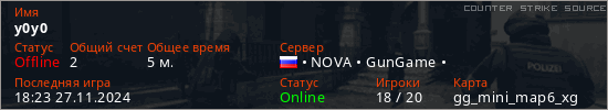 Играет на Counter Strike Source сервере. Страна: РоссияПервый раз замечен 18:21 27.11.2024