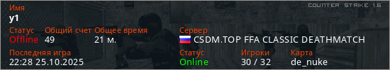 Играет на Counter Strike 1.6 сервере. Страна: РоссияПервый раз замечен 15:01 24.10.2025