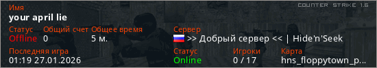 Играет на Counter Strike 1.6 сервере. Страна: РоссияПервый раз замечен 01:04 27.01.2026