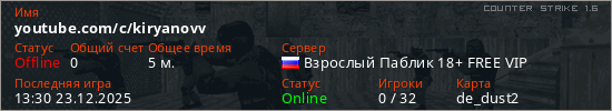 Играет на Counter Strike 1.6 сервере. Страна: РоссияПервый раз замечен 13:28 23.12.2025