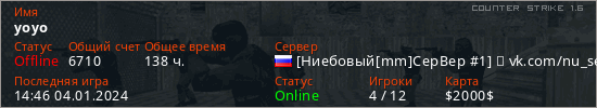 Играет на Counter Strike 1.6 сервере. Страна: РоссияПервый раз замечен 16:39 03.06.2022