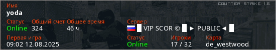 Играет на Counter Strike 1.6 сервере. Страна: РоссияПервый раз замечен 09:02 12.08.2025