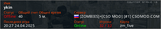 Играет на Counter Strike 1.6 сервере. Страна: РоссияПервый раз замечен 20:18 24.04.2025