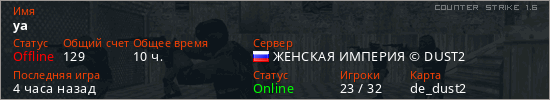 Играет на Counter Strike 1.6 сервере. Страна: РоссияПервый раз замечен 22:20 14.02.2025