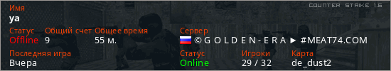 Играет на Counter Strike 1.6 сервере. Страна: РоссияПервый раз замечен 23:50 03.04.2023