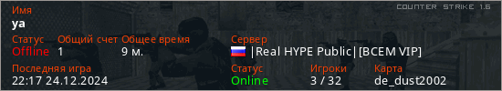 Играет на Counter Strike 1.6 сервере. Страна: РоссияПервый раз замечен 18:29 07.12.2024