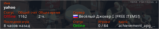 Играет на Team Fortress 2 сервере. Страна: РоссияПервый раз замечен 22:17 13.03.2026