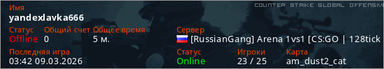 Играет на Counter Strike Global Offensive сервере. Страна: РоссияПервый раз замечен 03:21 09.03.2026