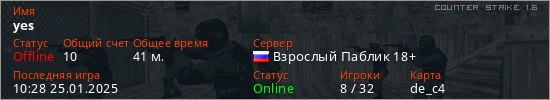 Последний раз был в сети 10:28 25.01.2025 Игрок с таким ником замечен на 31 сервере