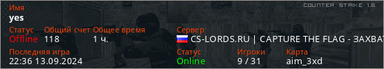 Последний раз был в сети 22:36 13.09.2024 Игрок с таким ником замечен на 31 сервере