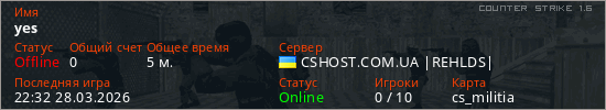 Играет на Counter Strike 1.6 сервере. Страна: УкраинаПервый раз замечен 22:05 28.03.2026