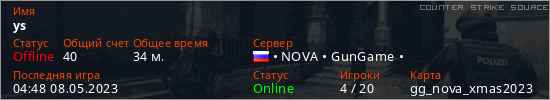 Играет на Counter Strike Source сервере. Страна: РоссияПервый раз замечен 05:15 30.04.2023
