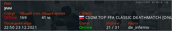 Играет на Counter Strike 1.6 сервере. Страна: РоссияПервый раз замечен 15:26 01.11.2021