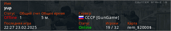 Играет на Counter Strike 1.6 сервере. Страна: РоссияПервый раз замечен 21:46 23.02.2025