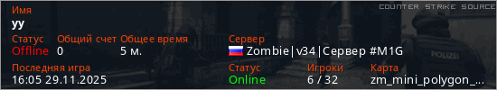 Играет на Counter Strike Source сервере. Страна: РоссияПервый раз замечен 15:51 29.11.2025