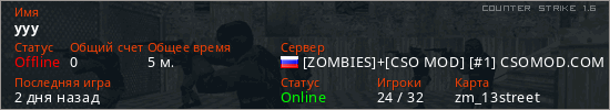 Играет на Counter Strike 1.6 сервере. Страна: РоссияПервый раз замечен 20:22 29.03.2026