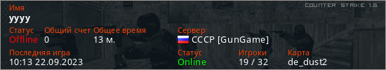 Играет на Counter Strike 1.6 сервере. Страна: РоссияПервый раз замечен 09:29 22.09.2023