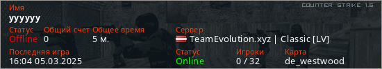 Играет на Counter Strike 1.6 сервере. Страна: ЛатвияПервый раз замечен 14:54 05.03.2025