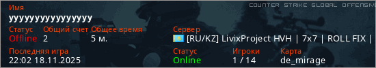 Играет на Counter Strike Global Offensive сервере. Страна: КазахстанПервый раз замечен 19:37 18.11.2025