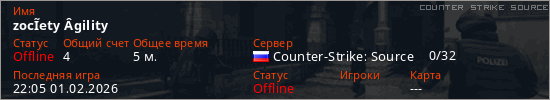 Играет на Counter Strike Source сервере. Страна: РоссияПервый раз замечен 19:29 01.02.2026