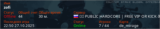Играет на Counter Strike Global Offensive сервере. Страна: РоссияПервый раз замечен 00:24 31.07.2025